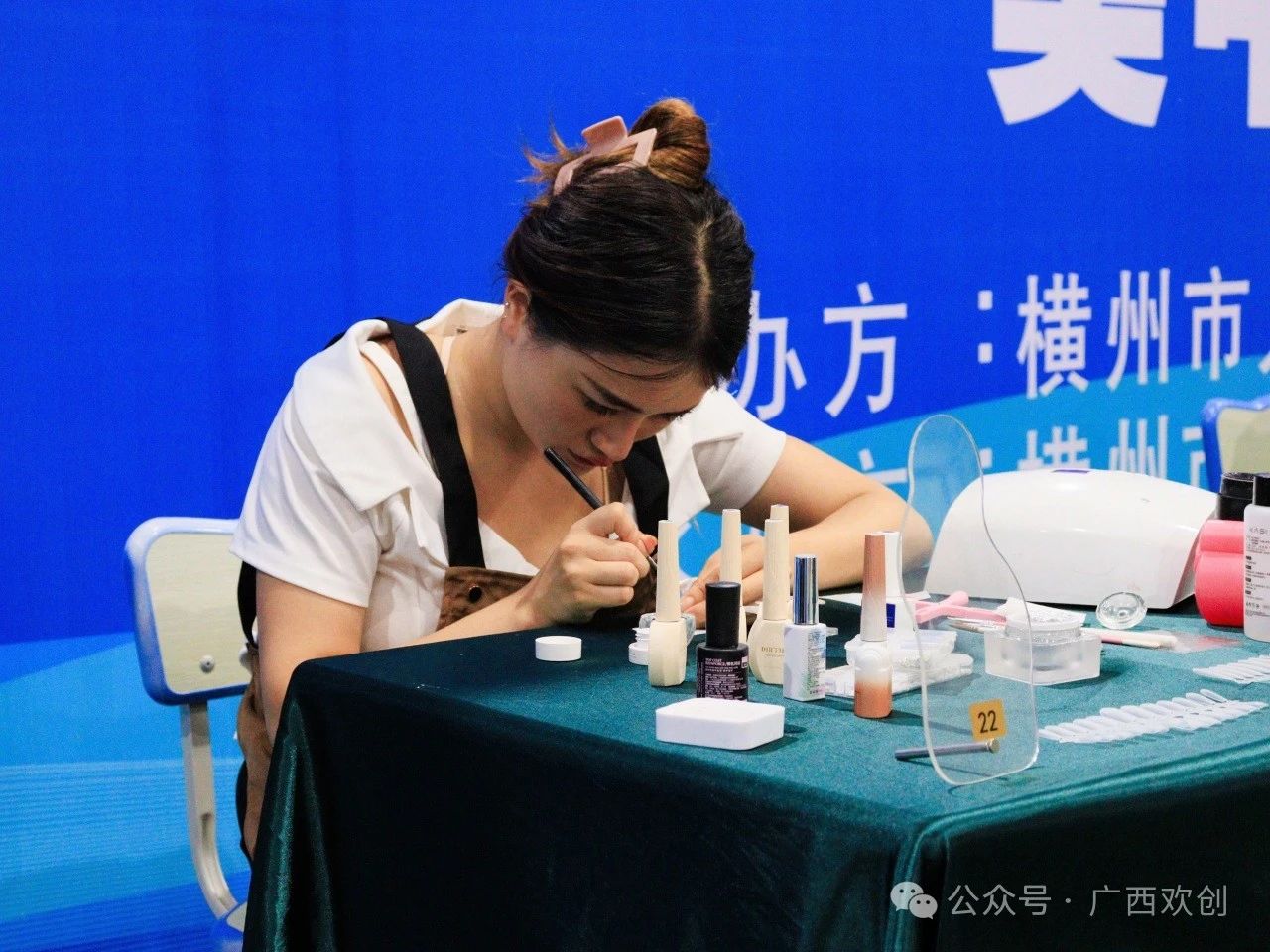 在美甲赛场,选手们在涂甲油技巧、构图、绘画、自由搭配造型等环节纷纷出真招、亮绝活,展现出美甲艺术的无穷魅力,也充分展示了横州市美甲行业的技术工艺水平。