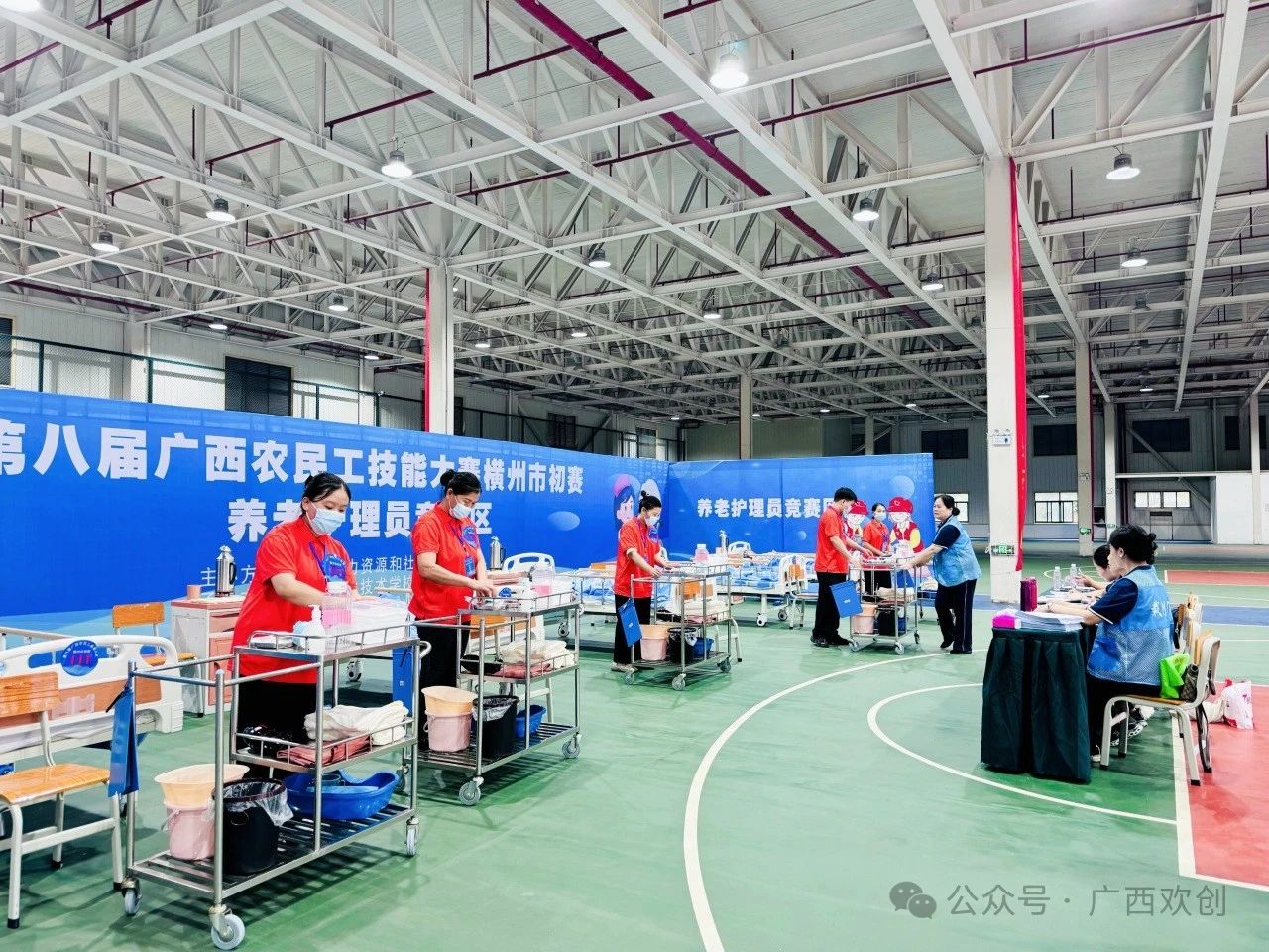 在医疗护理赛场,选手们精神饱满、信心十足,一边与“患者”唠家常、说贴心话,一边按照流程熟练展示各项护理技能,大家操作认真严谨、动作规范协调,表现出良好的技能水平和职业素养,展现了横州市医疗护理员积极向上的精神风貌。