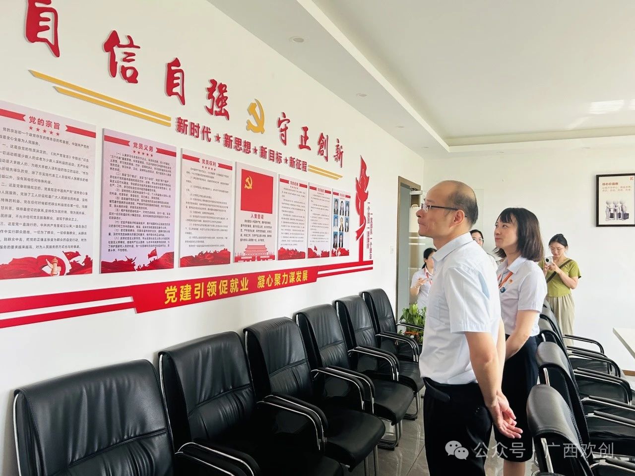 兴宁区委常委、组织部部长覃汉林在广西欢创妇联主席唐琳的陪同下参观了广西欢创人力资源有限公司的党建室,对广西欢创党建及妇建工作给予肯定并提出下一步工作要求:要深入贯彻落实习近平总书记关于“三新”领域妇联组织全覆盖的重要指示精神,坚持党建带妇建,灵活多样地把“三新”领域纳入妇联组织和工作体系,夯实党执政的妇女群众基础,为中国式现代化建设汇聚巾帼力量。