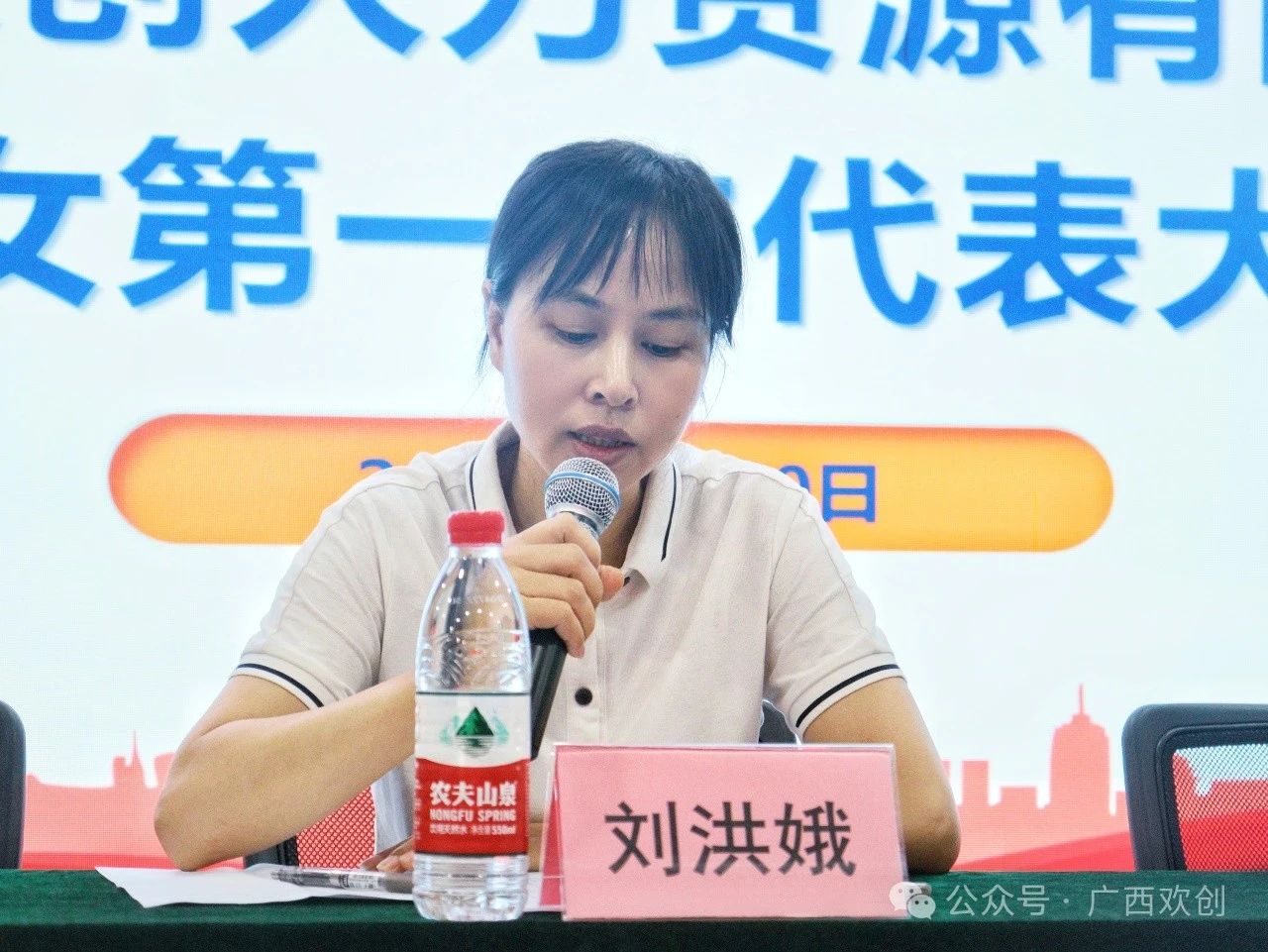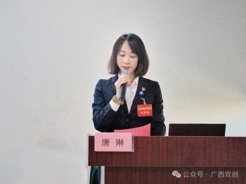 新当选的广西欢创妇联主席唐琳女士,在会上作表态发言,将不负重托,以满腔的热情和坚定的决心,带领、组织公司全体女职工在加强思想引领、助推巾帼建功、提供关爱服务、参与基层治理等方面发挥积极作用。为公司妇女事业发展抒写更加辉煌的篇章,积极为公司的发展贡献巾帼力量。