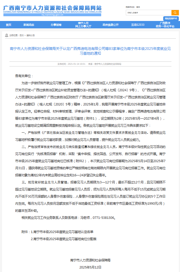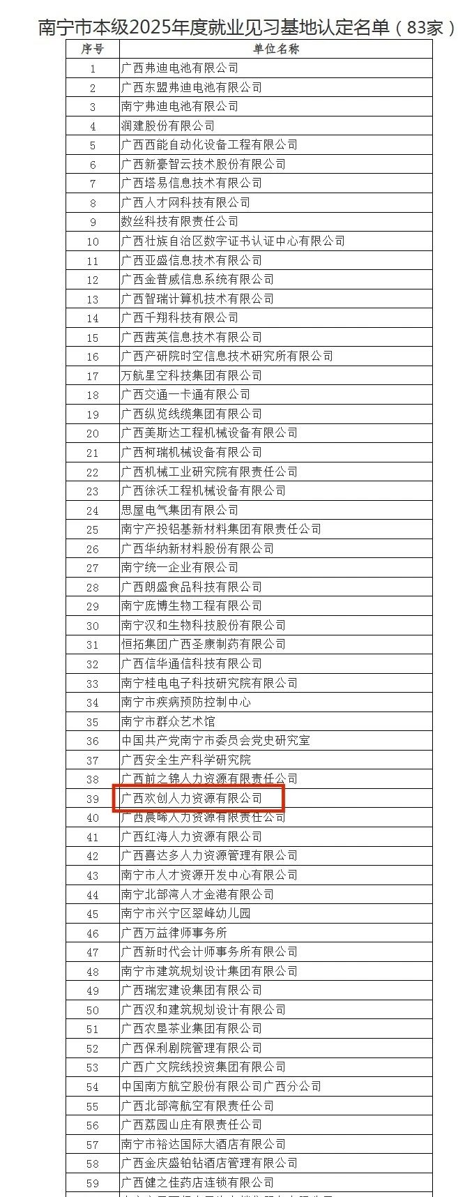 近期,南宁市人力资源和社会保障局开展南宁市本级2025年度就业见习基地申报认定工作。经单位申报、材料审核受理、评审会评审、实地核查和公示等程序,确定83家单位为南宁市本级2025年度就业见习基地,设立期限为2年(2025年5月—2027年4月)。广西欢创人力资源有限公司被评定为南宁市本级2025年度就业见习基地。